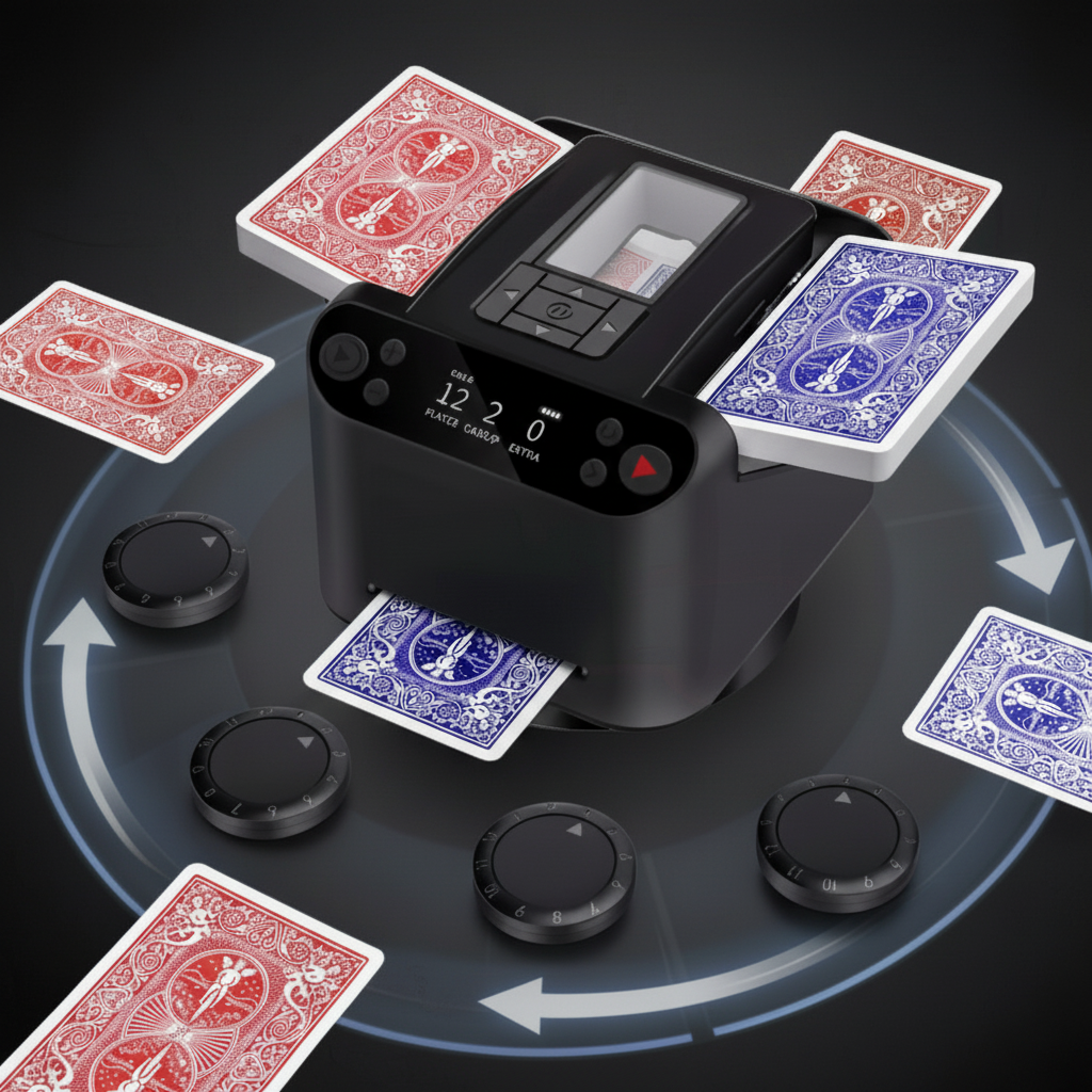 ShuffleBoss PRO™ replaces manual shuffling with fully automatic 360° dealing that’s fast, fair, and hands-free. From 2 to 12 players, everyone gets their cards evenly—no bias, no hassle.